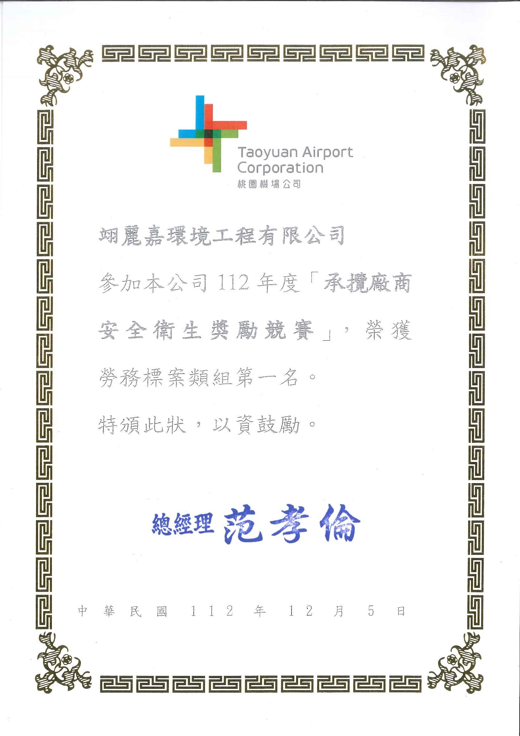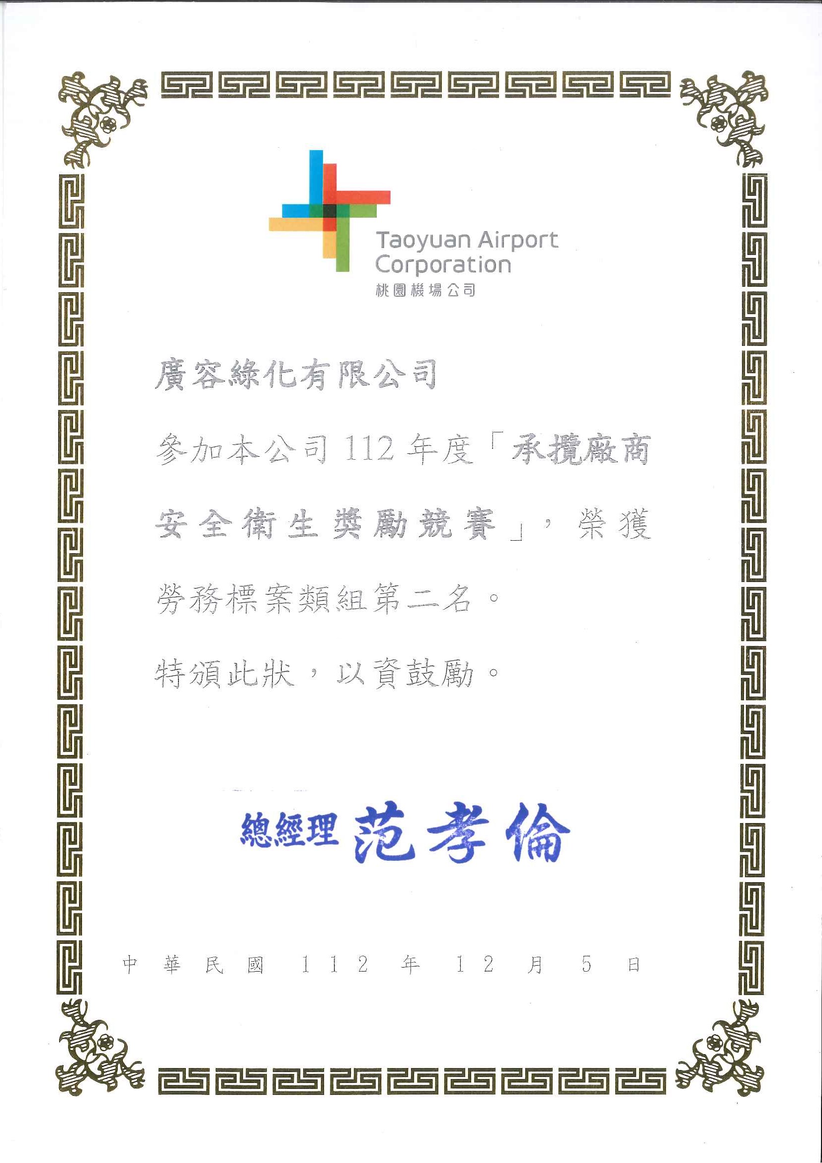 本公司參加112年桃園國際機場職業安全衛生競賽翊麗嘉與廣容,分別獲得第一名及第二名殊榮